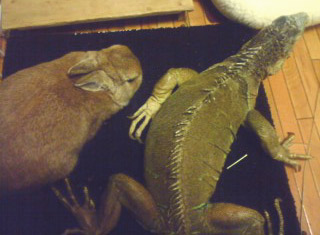ししまる(イグアナ)が、豆千代(うさぎ)のケージの中に入ってるんですね~…。